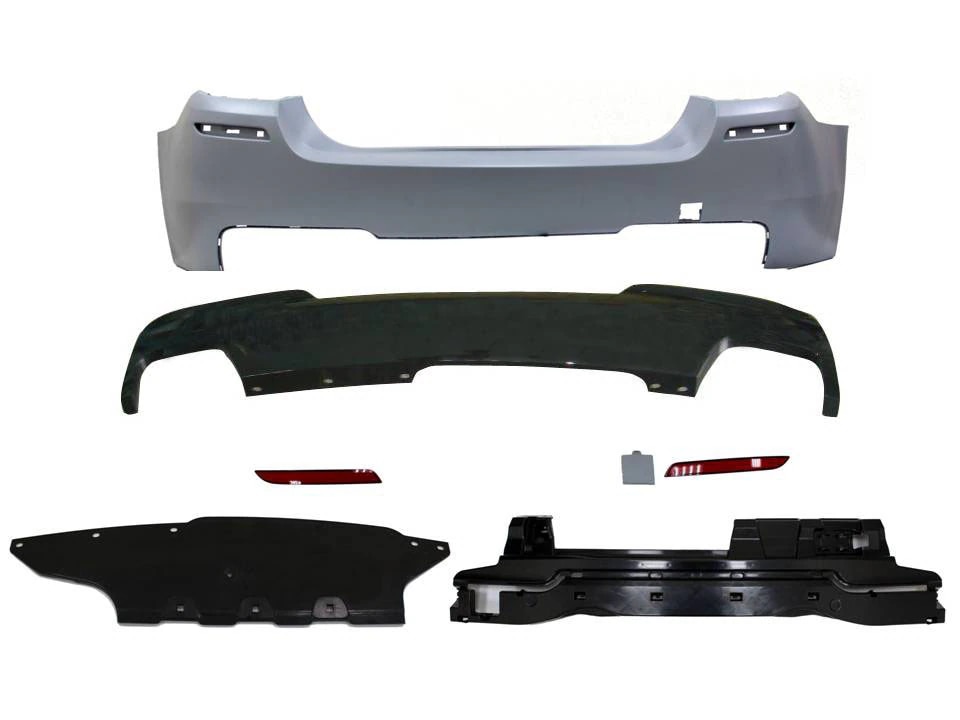 Upgrade the look of your F10 5-Series with a high quality aftermarket bumper cover. This bumper has openings for 2 exhaust tips - stock 550i configuration Whether you are replacing a damaged bumper, or you simply want to give your BMW a more modern appearance, we have your bumper covered. This complete rear bumper cover is designed to be installed using the factory mounting locations. Bumper kit includes the molded OEM-style plastic bumper cover as well as the rear diffuser.