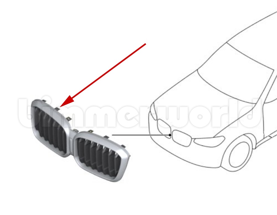 This original BMW matte chrome front kidney grille fits 2022-2024 X3 30i and 2022-2025 X4 30i models. This is the outer grille with vertical slats, but does not include the motorized air flap unit.