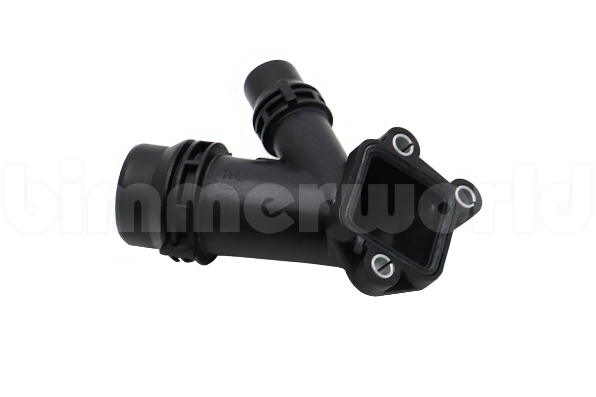 This plastic flange attaches to the engine block and is a connection point for the upper radiator hose on E90 335d (2009-2011) and E70 X5 3.5d, 35d (2009, 2010, 2011, 2012, 2013).