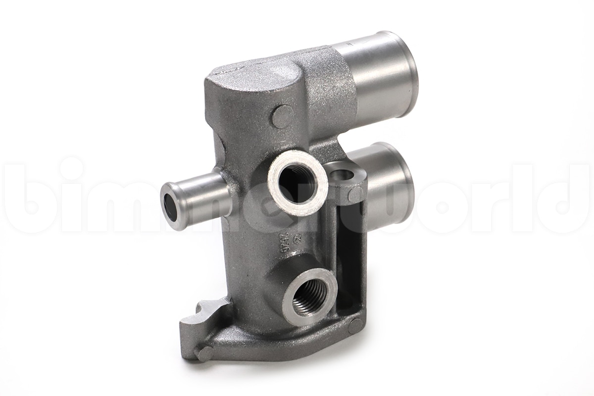 This item has a flange that fastens it to the engine block, and serves as a connection point for multiple cooling hoses and temperature sensors.