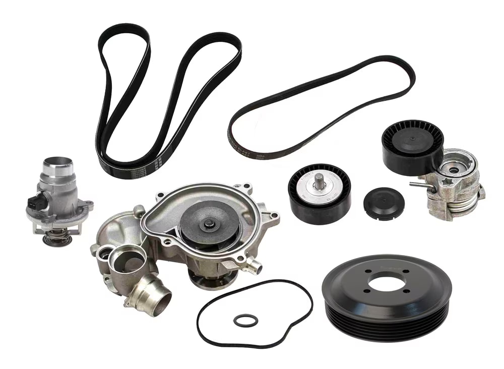 Package includes: 1 x 11517586779, water pump with metal impeller 1 x 11517508535, water pump profile gasket 1 x 11517507717, coolant return pipe o-ring 1 x 11537586885, thermostat 1 x 11531440192, thermostat gasket ring 1 x 11517504077, water pump pulley (upgraded aluminum) 1 x 11287631817, main drive belt 1 x 11287549588, main belt tensioner 1 x 11287549557, main belt deflection pulley 1 x 11287520177, A/C belt