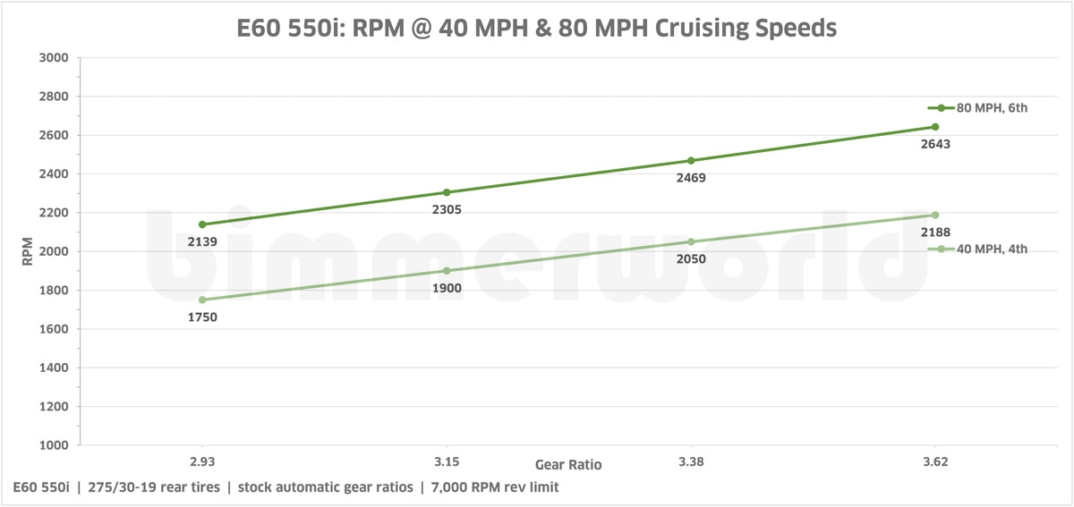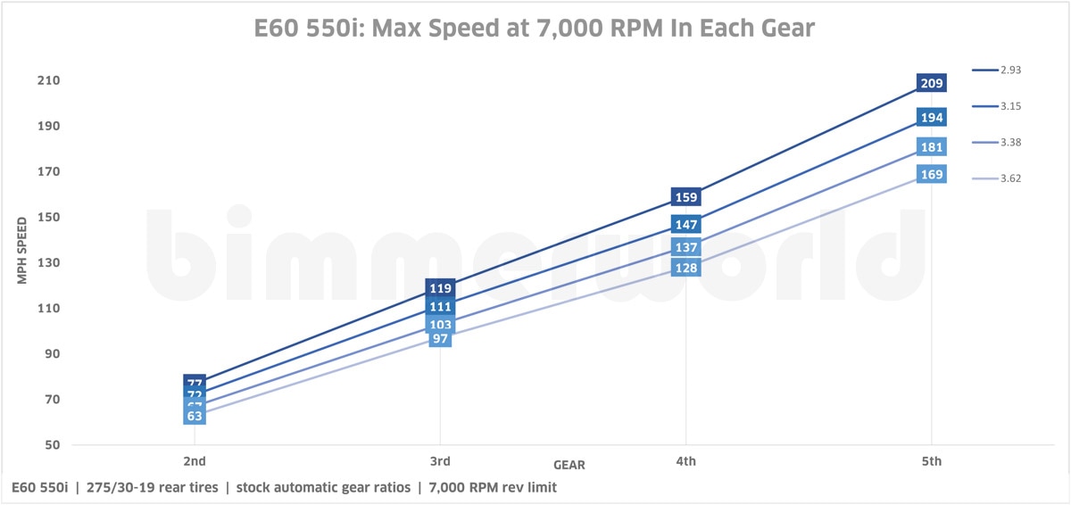 Stock gear ratios vary by model and transmission - from 2.93 to 3.46. The gear ratio you choose is based largely on personal preference and how you plan to use the car. The shorter gears (higher number) give better acceleration around town and more performance but will limit top speed and will have a higher RPM at highway speeds. Multiple gear options are available with your new diff to meet your acceleration needs. Refer to the charts below for speed and RPM data (data taken from a 550i automatic).