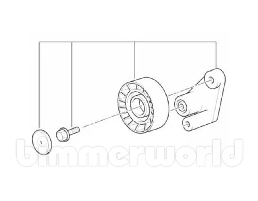 This is the original BMW replacement tensioner, pulley, and tensioner lever for the A/C belt on the 1999-2003 E53 X5 4.4i/4.6is. This is an assembled piece that includes the tensioner as well as two deflection pulleys. Perfect for when a complete overhaul is called for. The tensioner is like a small shock absorber that maintains pressure on the belt. A loose belt will cause insufficient charging from the alternator, poor cooling performance from the water pump, and stiffer steering from lower power steering pump output. It might also lead to the belt slipping from the pulleys or premature belt wear.