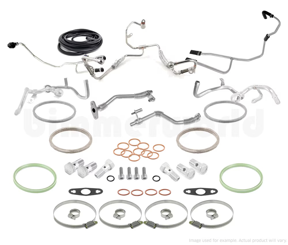 M5/M6 Turbo Install Kit includes: 2 x 18307553601, downpipe gasket 2 x 11657620508, downpipe clamp 2 x 11428627197, oil supply Banjo 4 x 07119963072, oil supply gasket ring 2 x 11428624158, oil return pipe gasket 2 x 11427578079, oil return o-ring 4 x 07129905536, oil return pipe screw 2 x 11657845076, exhaust manifold seal 2 x 11657620507, exhaust manifold clamp 2m 3.5 vacuum line 2 x 11538607960, coolant pipe Banjo (bank 1) 2 x 11537847365, coolant pipe Banjo (bank 2) 10 x 07119963201, coolant supply gasket ring 2 x 11657848368, turbo outlet preformed seal 1 x 11538092640, coolant supply pipe (lower) 1 x 11538053158, coolant supply pipe (bank 1) 1 x 11538053160, coolant supply pipe (bank 2) 1 x 11538092641, coolant return pipe (lower) 1 x 11538053159, coolant return pipe (bank 1) 1 x 11538053161, coolant return pipe (bank 2) 1 x 11428053164, oil supply pipe (banks 1 & 2) 1 x 11427844986, oil return pipe (bank 1) 1 x 11427844987, oil return pipe (bank 2) 4 x 16mm hose clamp (coolant hoses) 4 x 70mm hose clamp (intake tubes)