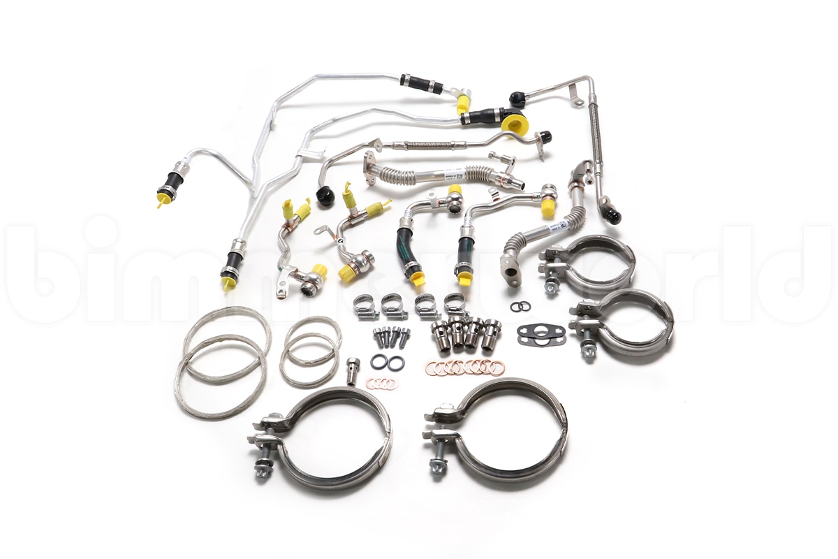M5/M8 Turbo Install Kit includes: 2 x 11658064568, downpipe clamp 2 x 18307553601, downpipe gasket 2 x 11428627197, oil supply Banjo bolt 4 x 07119963072, oil supply gasket ring 2 x 11427558936, oil supply lower o-ring 4 x 11538607960, coolant pipe Banjo bolt 8 x 07119963201, coolant pipe gasket ring 2 x 11658088736, exhaust manifold clamp 2 x 11657845076, exhaust manifold gasket 1 x 11428089004, oil return pipe, bank 1 1 x 11427852376, oil return pipe, bank 2 2 x 11428624158, oil return pipe top profile gasket 4 x 07129905536, oil return pipe screw 2 x 11427578079, oil return pipe o-ring 1 x 11427934654, oil supply pipe, bank 1 1 x 11427934655, oil supply pipe, bank 2 1 x 11538092598, coolant supply pipe, bank 1 1 x 11537883931, coolant supply pipe, bank 2 1 x 11538092600, coolant supply main line 1 x 11538092596, coolant return pipe, bank 1 1 x 11538092595, coolant return pipe, bank 2 1 x 11538092597, coolant return main line 4 x 16mm hose clamp (for coolant hoses)