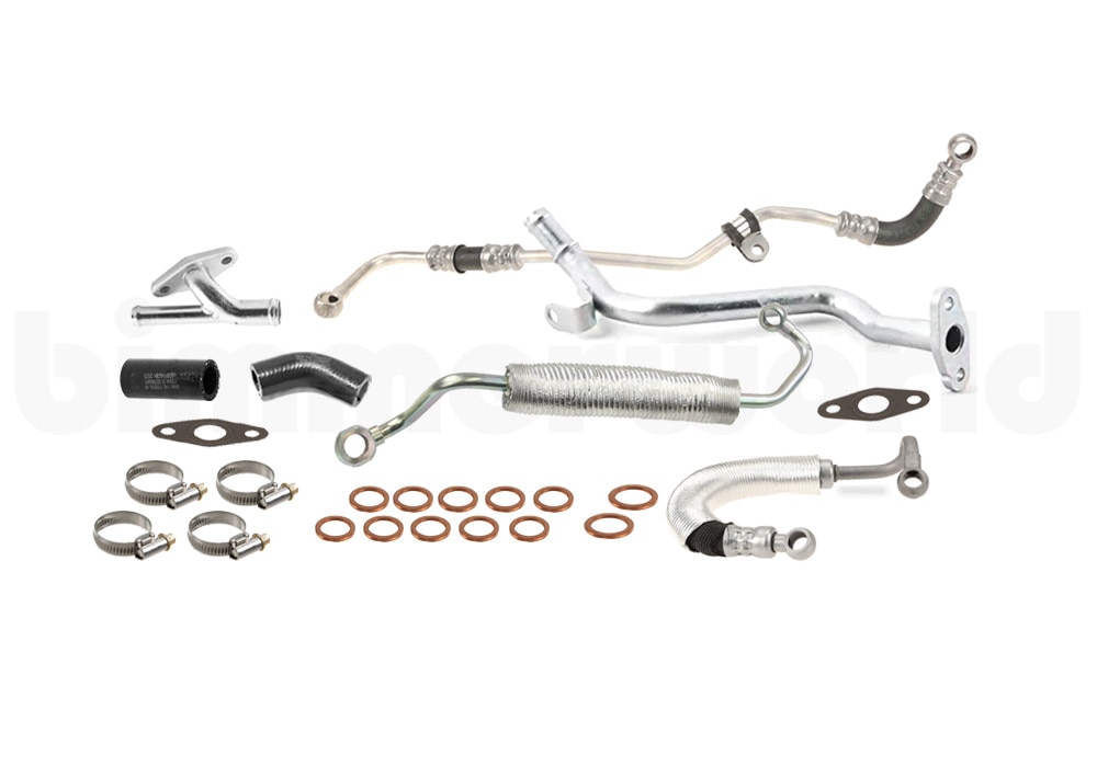Set of turbo oil hoses to overhaul the oil lubrication lines on both turbos of the M57 Diesel engine in the E90 335d. If you have one or more leaky oil lines you might as well replace as much of the system as you can “while you're in there”. Some of these pieces are metal and don't necessarily need a replacement, but we find it's often easier to pre-assemble certain pieces and sections rather than trying to do on the car. Individual pieces are also available to assemble your own kit (call or email).