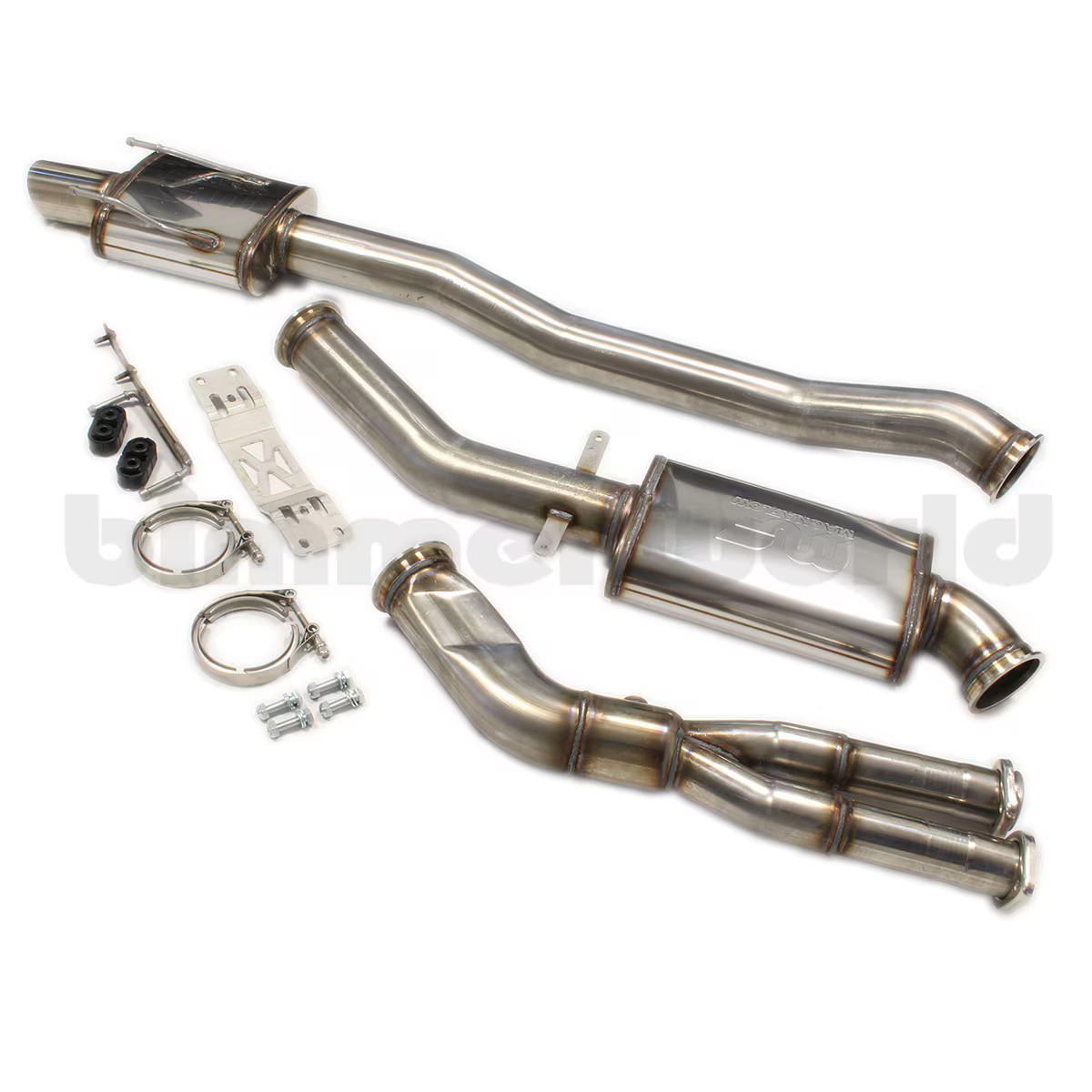 Design - The BimmerWorld E46 M3 Exhaust is 100% stainless steel for a long life. We utilize stock mounting points in both the center brace and rear of the car to support the exhaust properly. Stock center mounts are reused and new rear mounts and a stainless bolt-on rear hanger are included. V-band clamps are used throughout the system to join sections so car maintenance at the track becomes very a quick job.