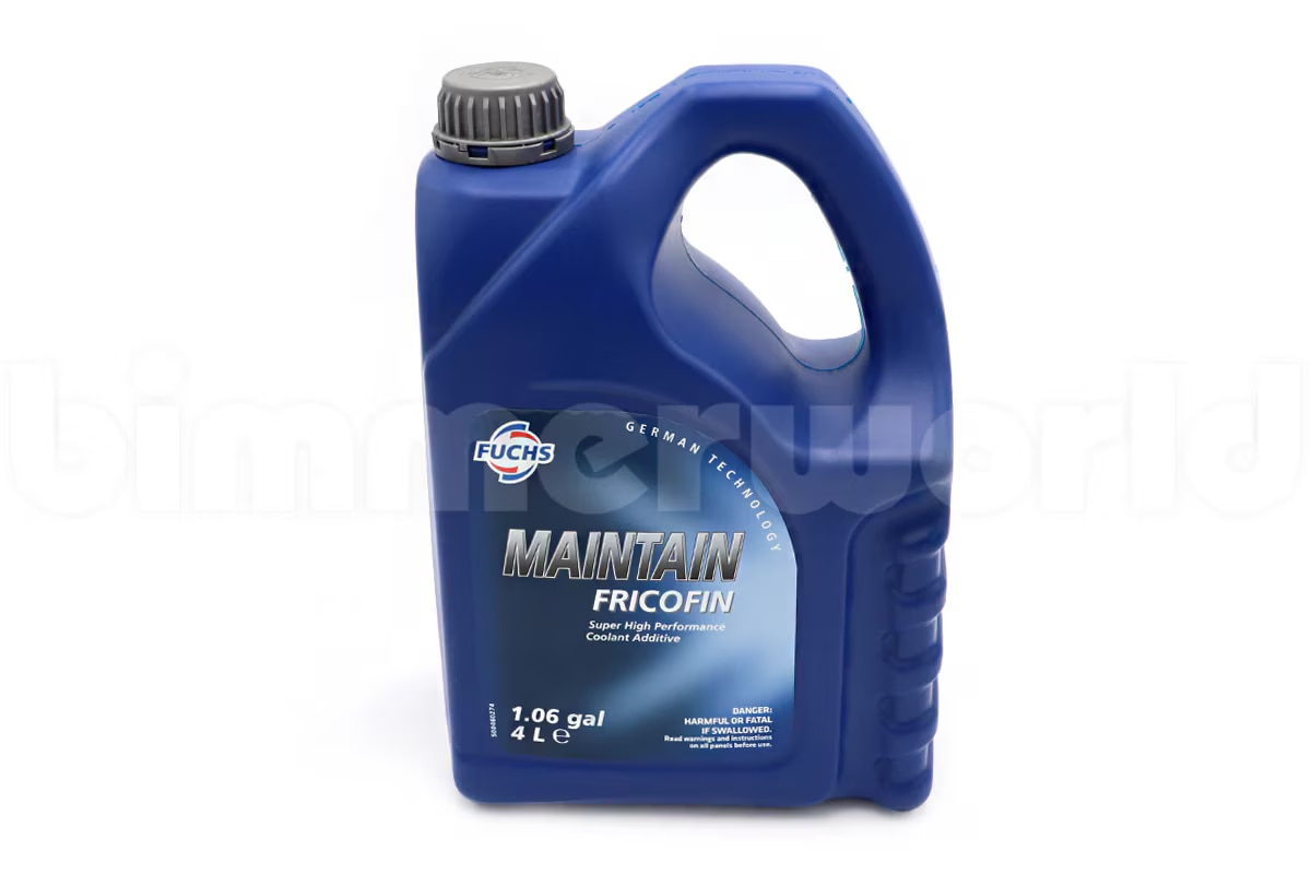 Fuchs Maintain Fricofin coolant is approved by BMW and meets GS94000 and N600690 standards. Fricofin is based on mono ethylene glycol and is free of nitrite, amine, and phosphate. It's a blue color to conform with BMW and DOT requirements. Due to its highly active component package, Fricofin protects all metals used in coolant systems. At a 50/50 mix it has a higher boiling point than standard BMW coolant. Off-the-shelf coolant from a local parts chain is usually not compatible with BMW cooling systems and mixing different coolant formulas should be avoided (in a pinch you should use distilled water).