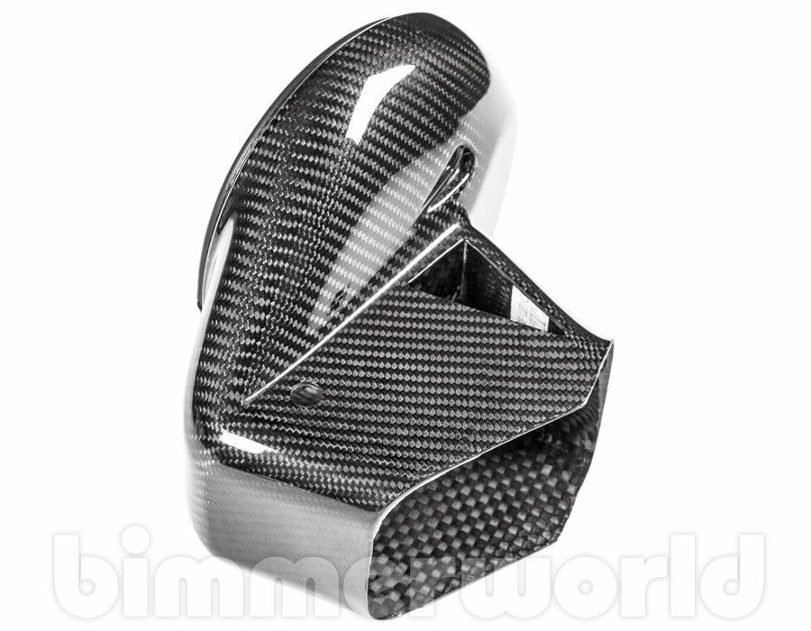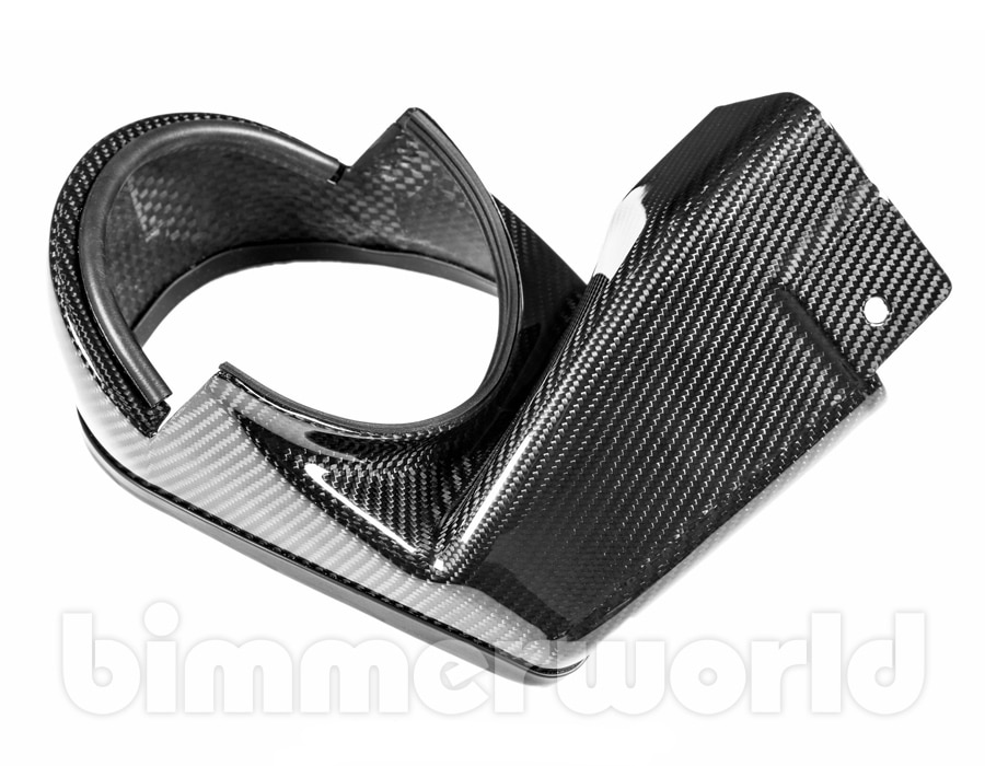This pair of gloss black carbon fiber ducts are used to convert the older F8X S55 Eventuri V1 intake kit into the later V2 sealed intake version. These ducts direct fresh air to the intake filters, blocking out the warm air found in the engine compartment.
