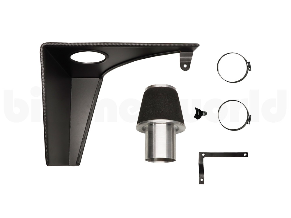 Cold-air intake kit for 2001-2006 E46 330i, 330ci, and 330xi. This uses a high-flow foam conical filter and E46-specific heat shield that will improve airflow and really wake up the intake sound.