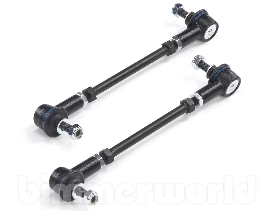 The E82 128i/135i/1M, E9X 325i/328i/330i/335i, E89 Z4 28i/30i/35i/35is front sway bar link connects the sway bar (anti roll bar) to the rest of the suspension. As the suspension and the sway bar go through their motions the link rotates and twists. On cars that get lowered suspensions or track use the stock ball joints in the link get a real workout. These upgraded front swaybar links use high-articulation rod ends - heavy duty and race-spec components that help the link last longer and perform better under the stresses of the race track.