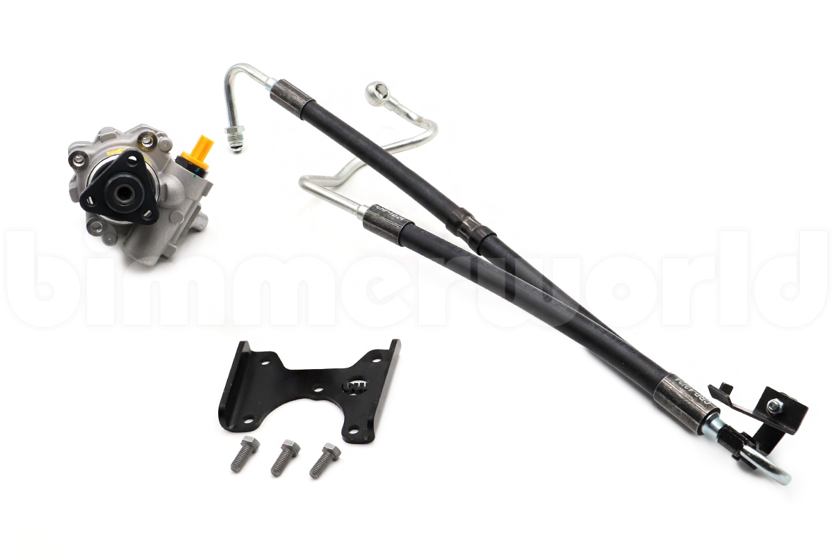 Upgrade kit includes: 32416756582, LuK power steering pump 32421740780, pump bracket 07119903039 (x3), bracket screws 64508390601, gasket ring from pump to hose 32416764725, Rein pressure hose from pump to rack 32411093596, gasket ring from hose to rack