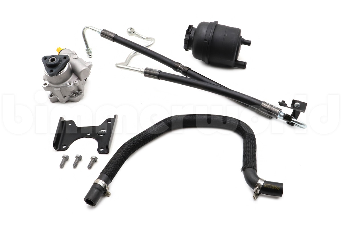 Upgrade kit includes: 32416756582, LuK power steering pump 32421740780, pump bracket 07119903039 (x3), bracket screws 64508390601, gasket ring from pump to hose 32416764725, Rein pressure hose from pump to rack 32411093596, gasket ring from hose to rack 32416851217, OEM fluid reservoir 32416750155, OEM hose from reservoir to pump (for 2002+ models only)