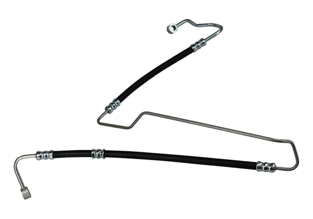 This runs from the power steering pump to the steering rack. At either end is a hard metal line secured with a bolt and copper crush washer. The hose has extra length so the system can have more fluid capacity. Unfortunately it has a lot fittings where rubber hose meets metal line. These fittings are compression crimp-style swage ("swedge") fittings that are very common in the automotive world. These swage fittings are the most common area for PS leaks on your BMW. It's easier to replace the entire line with a new OEM or BMW part than to try and repair the line.