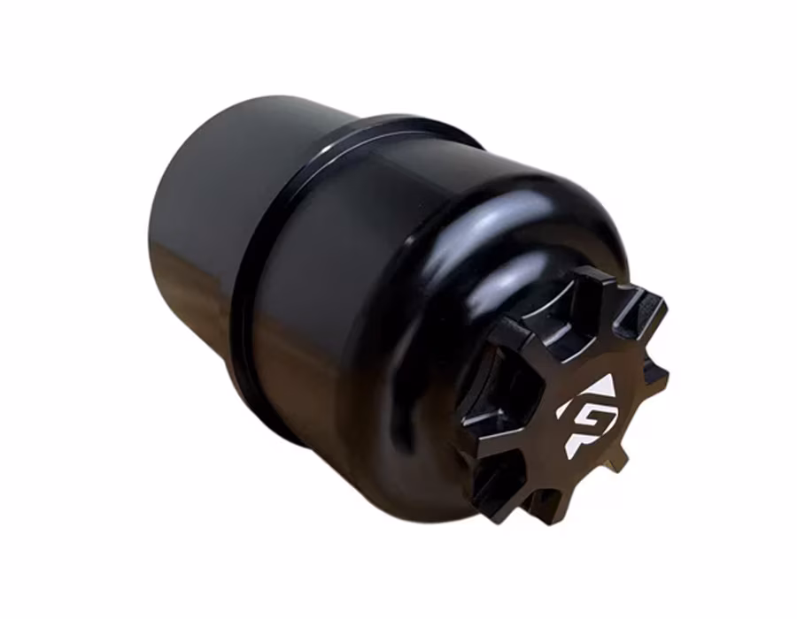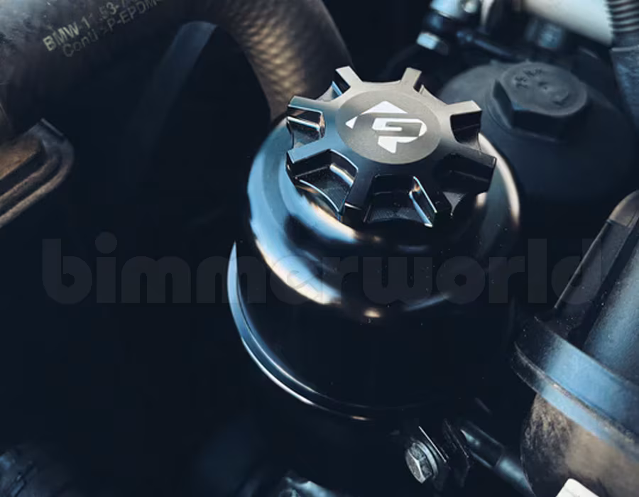 Bulletproof your steering system with this Race German billet aluminum power steering reservoir. The stock plastic fluid container on your BMW is prone to cracks and leaks, as the plastic ages with heat cycles. This upgraded steering reservoir and threaded cap are machined from T6061 billet aluminum, offering the ultimate in performance and durability. The integrated baffle controls fluid flow, reducing fluid foaming at high RPM.