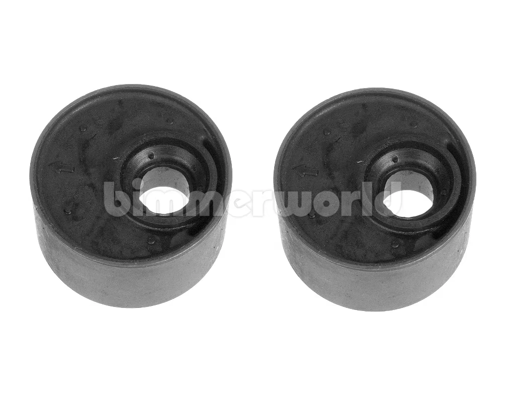 Offset control arm bushings change the orientation of the control arm by adding more caster and negative camber. The solid rubber design has less deflection than a webbed rubber bushing. This helps to improve handling and steering response. The standard bushings have the hole in the center. Offset bushings move the hole to the outside which pushes the wheel/hub further forward (caster) and more to the outside (camber). Offset bushings were standard on the E30 M3 Evo models and the 1995 E36 M3 but can be installed on other E30, E36, Z3 models too.