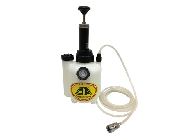 This CTA Tools brake bleeder creates pressure to push brake fluid through the system. Attaches to brake master cylinder using vehicle-specific adapters (sold separately).