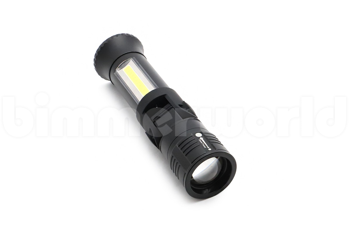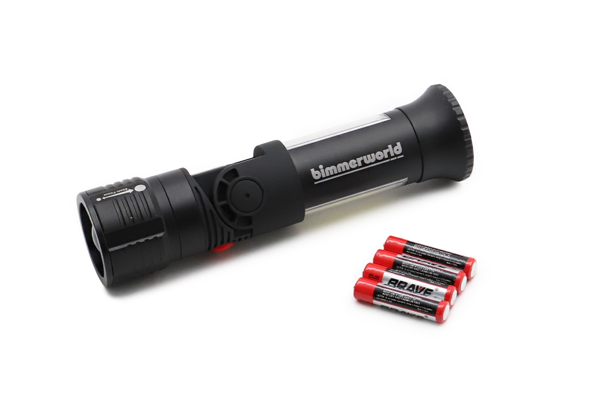 This flashlight is more than just fun Bimmer-Swag – It's actually a real life saver if you find yourself in a roadside repair or emergency situation. It has a standard flashlight head packed with a CREE® XP-E2 R2 (so bright we would not recommend pointing it in someone's eyes or face!) It has a telescopic focus that allows you change the beam width, either a wider spread to light up a larger area, or a tight focus for a spot-light effect. It backs a punch with 120 Lumens on high in flash light mode.
