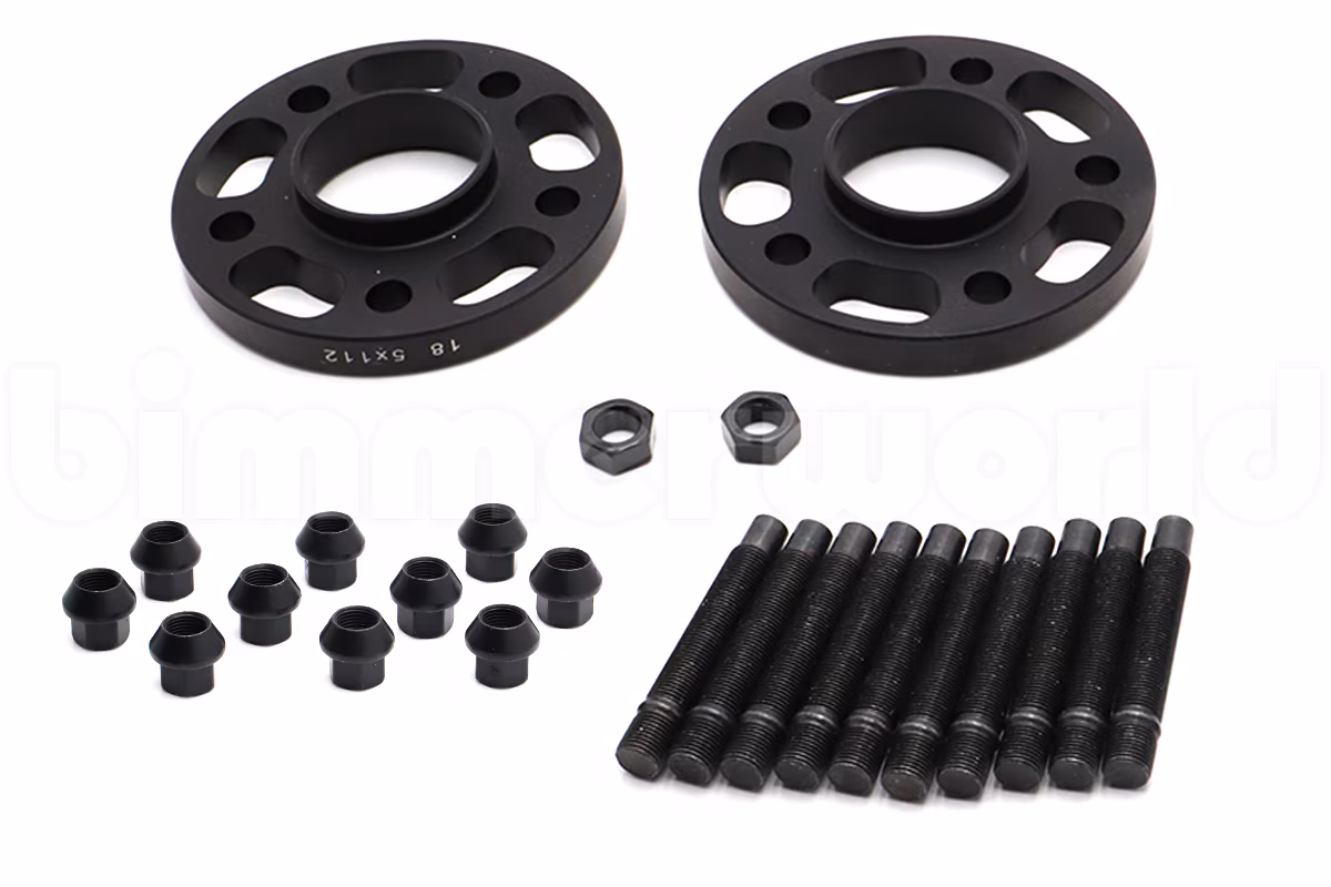 A convenient package that includes two 18mm hubcentric wheel spacers (for 5x112mm bolt pattern BMWs with 66.56mm center bore) as well as ten (10) street wheel studs (to convert from wheel bolts to wheel studs) as well as ten black wheel nuts. This is enough hardware to convert one axle (two wheels, either front or rear).